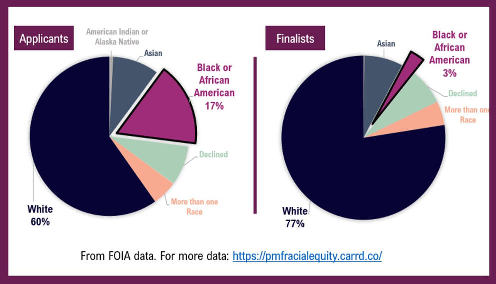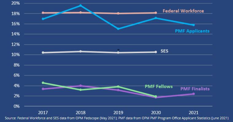 The presidential management fellowship (PMF) program is a “flagship leadership development program” designed to develop government leaders.Yet from 2016 to 2020, the percentage of Black PMF Fellows dropped by over 83%.White applicants were almost eight times more likely to be chosen as a finalist than Black/African American applicants in from 2017 to 2021.